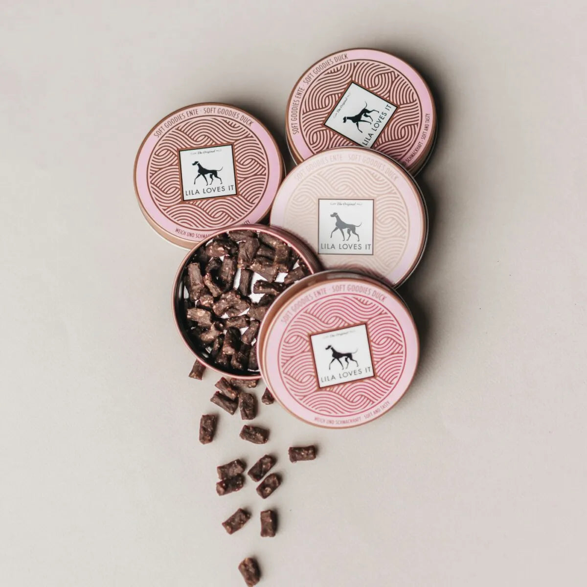 Onze krokante eendenvlees brokjes zijn een treat voor je hond. Kokosvlokken maken de beloning extra zoet. Lijnmeel, gewonnen uit het gedroogde zaad van de oude gekweekte plant lijn, is rijk aan omega-3 vetzuren en bevordert een gezonde spijsvertering. Verpakt in een chique metalen blik waarvan het vrolijke gekletter hondenharten sneller doet kloppen.